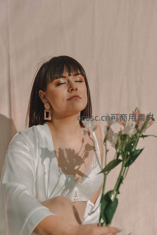 室内光影中女子手捧鲜花闭目冥想
