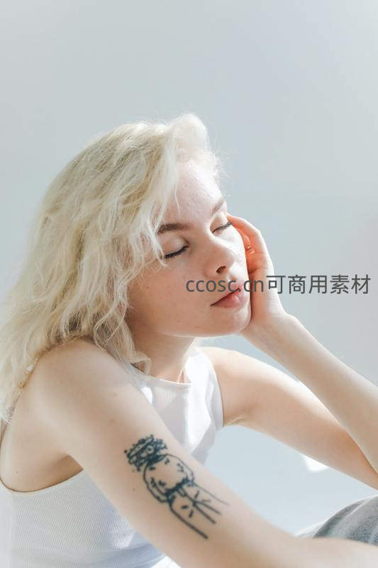 金发女子闭目养神,手轻抚脸颊,手臂上的简约纹身清晰可见,整体画面纯净而充满内省的宁静感。