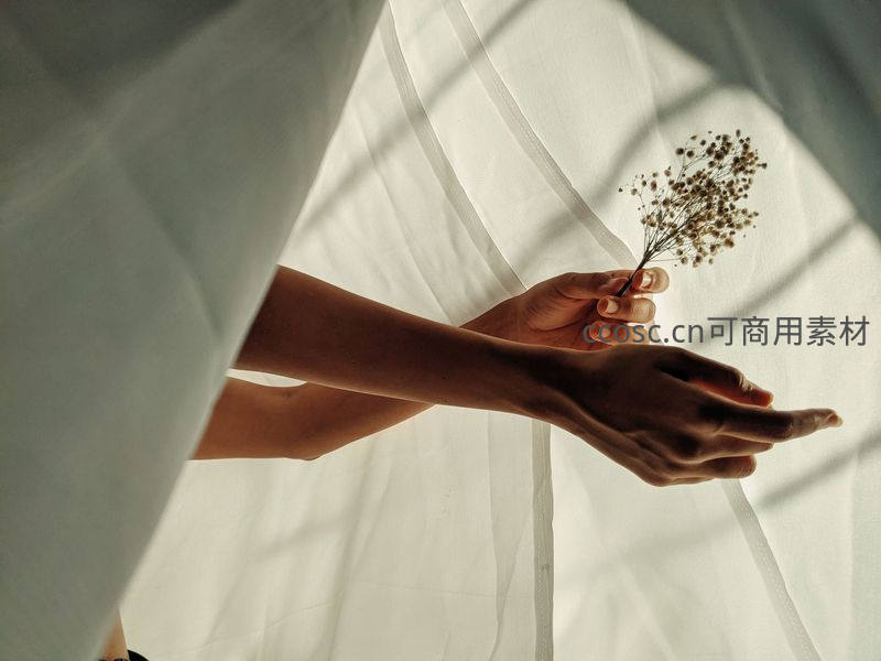 在洒满阳光的窗前,一双纤细的手轻轻托着一束干花,白色纱帘投下斑驳光影,整个画面如诗般宁静优雅。