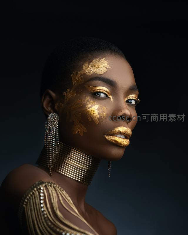一位非洲女性身着华丽金色饰品,面部绘有金箔花纹,眼神深邃,整体造型融合传统与现代,彰显异域文化的尊贵与艺术美感。