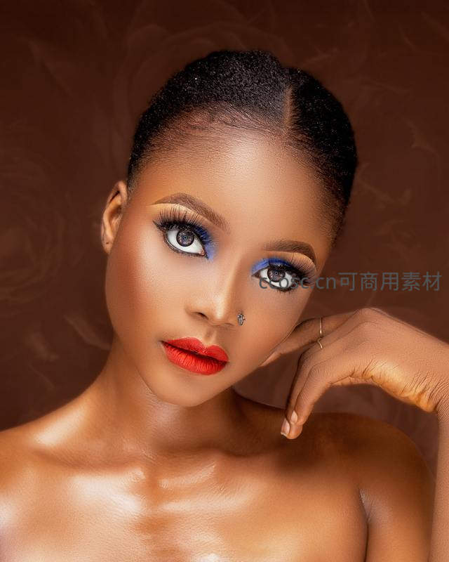一位非洲女性以蓝色眼影和鲜红唇膏打造大胆撞色妆容,发型简洁,姿态优雅,背景暖棕衬托肤色光泽,展现自信与美感。