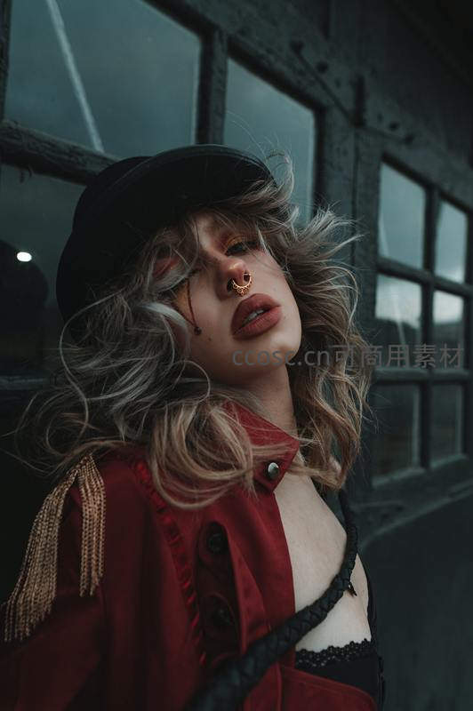 在工业风背景前,一位金发女子头戴黑色礼帽,身穿红色夹克,搭配鼻环与凌乱卷发,展现出不羁的街头潮流风格。