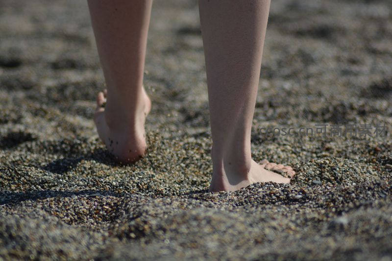 赤足漫步沙滩,细沙印下足迹