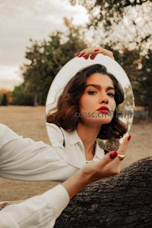 女子在户外手持圆形镜子,镜中映出她沉静面容与卷发,红指甲与白衬衫形成对比,背景树木与天空增添自然文艺气息。
