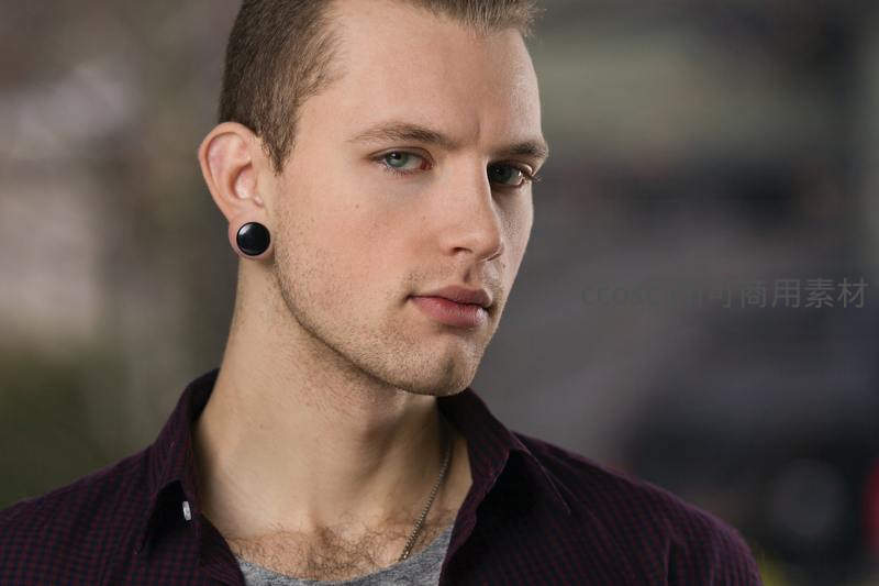 年轻男子佩戴黑色耳钉,身穿格子衬衫,侧脸望向远方,眼神专注而冷峻,展现现代都市青年的潮流与自信。