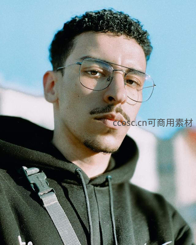 戴金属框眼镜的青年站在晴朗蓝天下,穿着黑色连帽衫,表情沉静,散发出文艺与随性的青春气息。