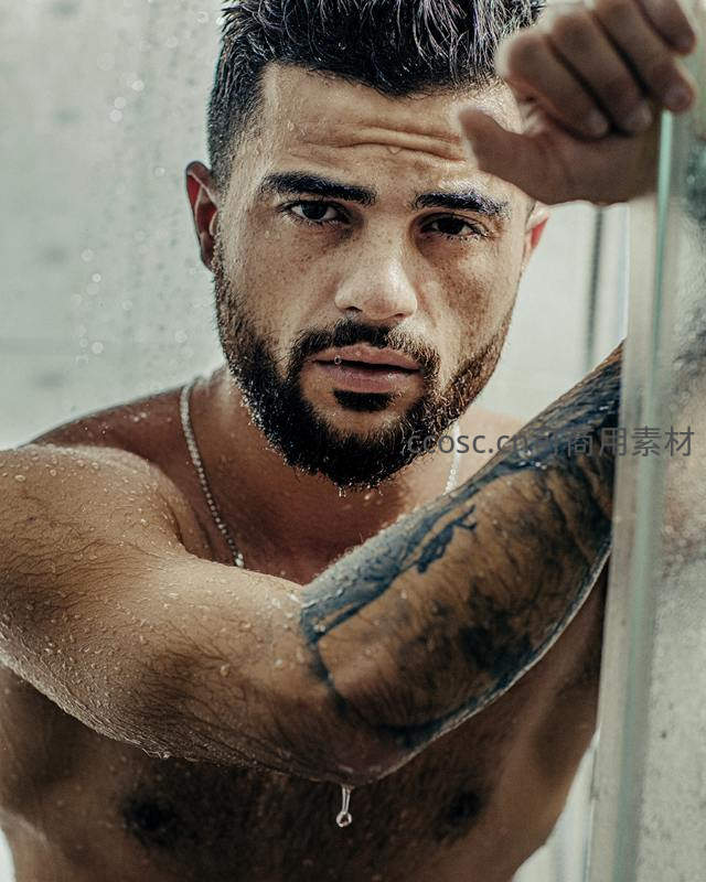 淋浴中的纹身男凝视