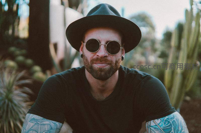 男子头戴黑色礼帽配圆形墨镜,双臂纹身醒目,坐在仙人掌丛中微笑望向镜头,融合复古与街头风的户外时尚肖像。