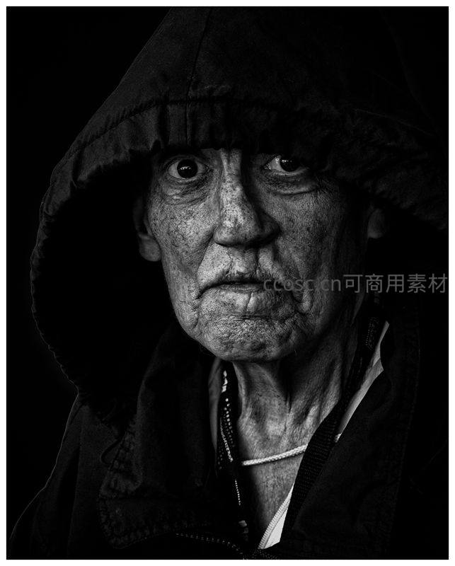 一位身披兜帽的老人,在纯黑背景前凝视前方,布满斑点和皱纹的脸庞与锐利的眼神形成强烈对比,传递出坚韧与孤寂并存的生命状态。