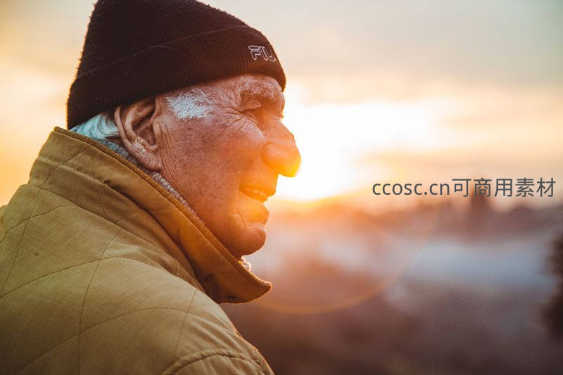 老人侧脸迎向落日,暖光洒在脸上,嘴角微扬,背景霞光氤氲,营造出温馨、安详且充满希望的黄昏氛围。