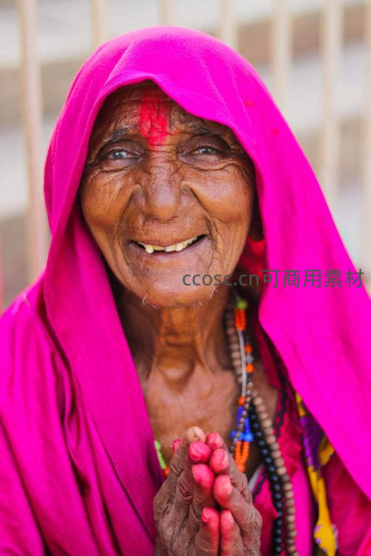 一位身披鲜艳粉红色纱丽的老妇人,额头点着吉祥痣,双手合十呈祈祷姿态,脸上洋溢着温暖而虔诚的笑容。