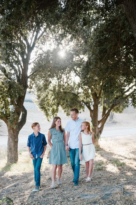 阳光穿透树影,一家四口漫步乡间小径