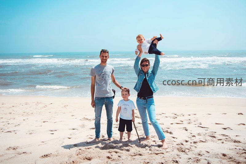 一家三口在阳光明媚的沙滩上玩耍,母亲高举婴儿,父亲牵着儿子,海浪轻拍岸边,尽显夏日度假的轻松与家庭温情。