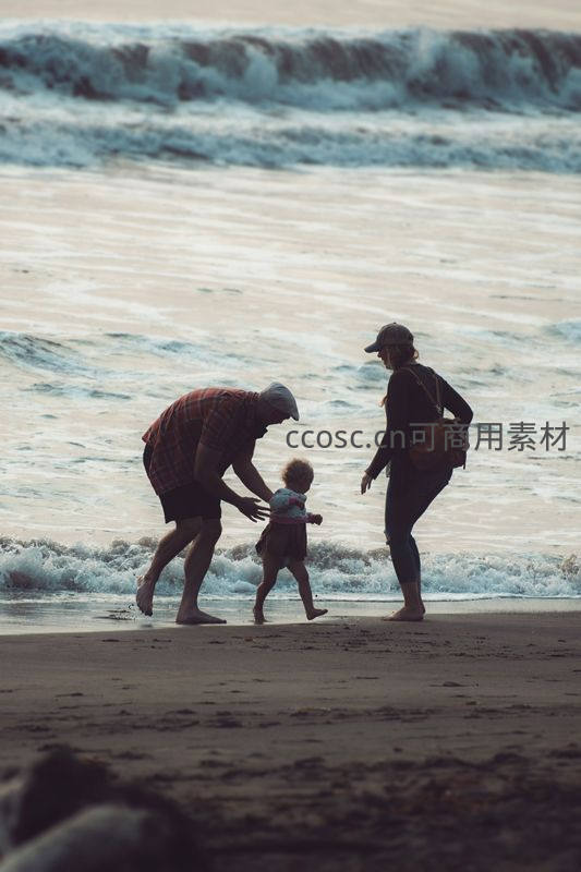 夕阳西下,父母牵着蹒跚学步的幼儿在沙滩边漫步,海浪轻拍脚踝,一家三口的身影被染成剪影,尽显宁静与幸福。