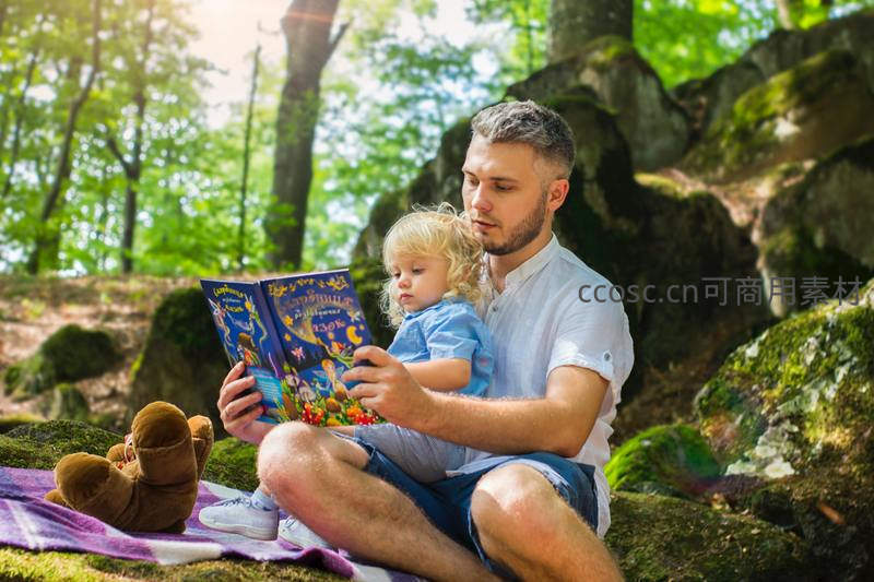 父亲在绿意盎然的森林岩石上为怀中幼儿朗读童话书,身旁放着毛绒玩具和野餐垫,阳光穿过树叶洒下斑驳光影,尽显自然亲子乐趣。