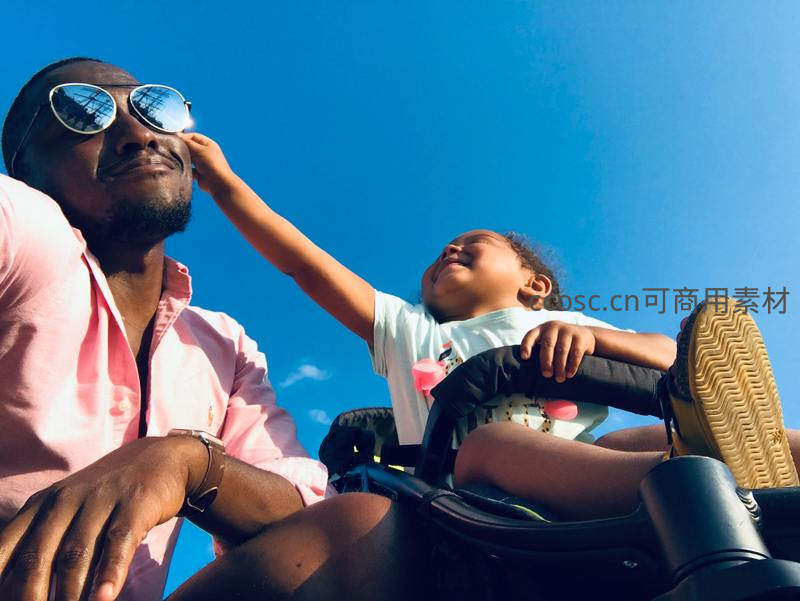 父亲戴着墨镜,孩子坐在轮椅上伸手轻触父亲脸庞,仰望湛蓝天空,画面充满温情与希望,展现无障碍陪伴和积极乐观的生活态度。