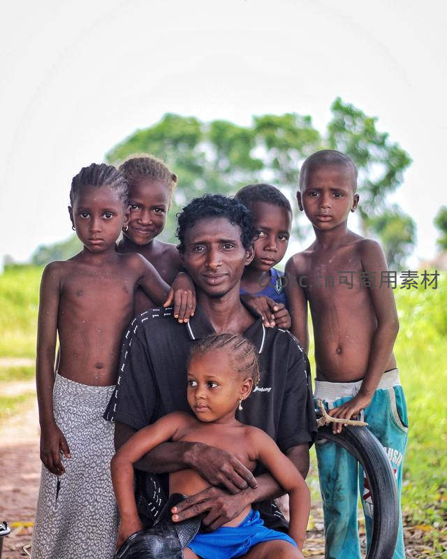 一位非洲父亲怀抱幼女,身后围绕着几个孩子,站在乡间小路上,神情质朴,展现了浓厚的家庭纽带与乡土气息。