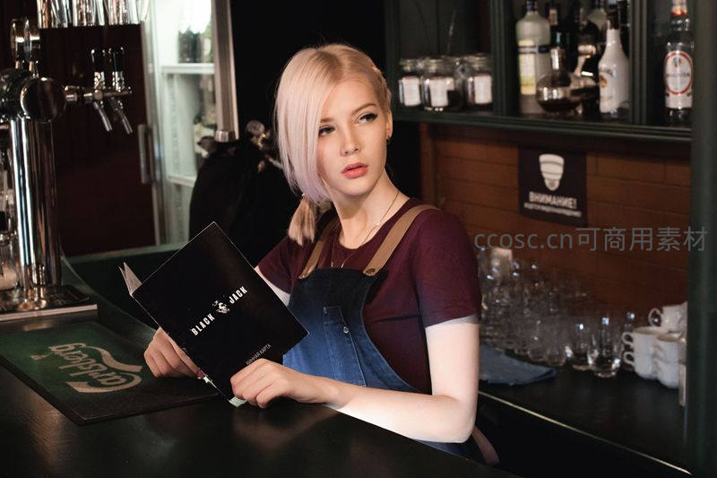 酒吧女调酒师手持菜单凝视前方
