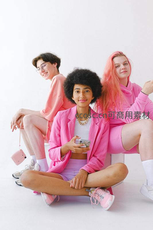 三位少女身着统一粉色系服装,在白色背景下亲密合影,中间女孩手持相机,整体画面甜美温馨,充满青春友谊气息。