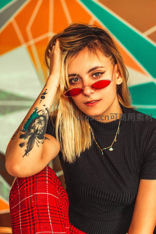 金发少女佩戴红色墨镜与鼻环,手臂纹身醒目,身穿黑色上衣与红格裙,倚靠在几何色块背景墙前,展现个性张扬的街头时尚风格。