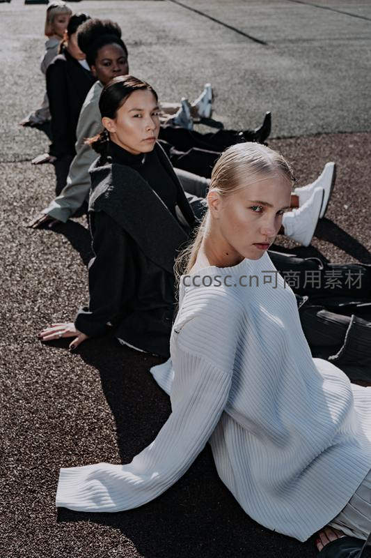 几位模特在户外铺装地面上依次坐姿排开,穿着简约高级的黑白服饰,阳光洒落形成强烈明暗对比,呈现现代时装秀的街头感。