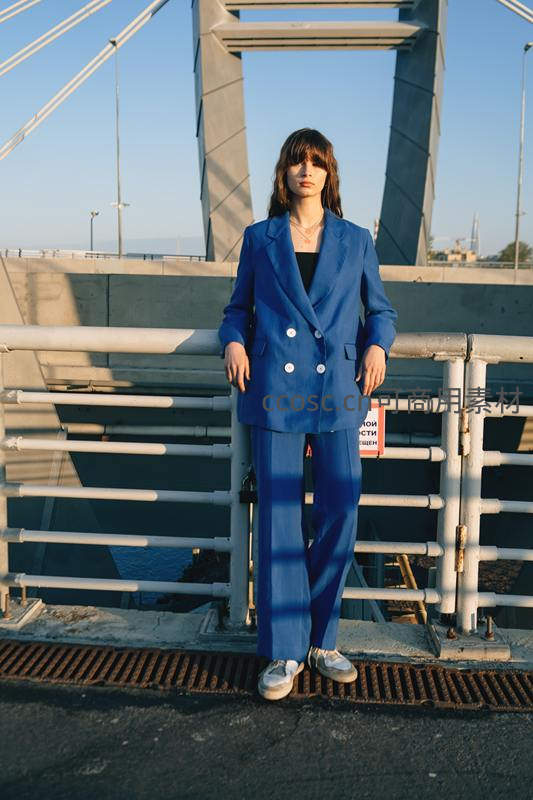 一位身穿蓝色西装套装的女性站在现代桥梁上,阳光洒落,金属栏杆与远处建筑构成冷峻工业美感,展现都市独立女性气质。