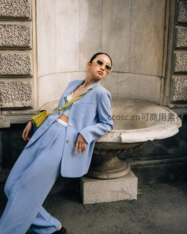 一位穿着浅蓝色西装的女性斜靠在古典石雕旁,佩戴墨镜和黄色小包,姿态慵懒而时髦,背景是复古墙面,充满都市艺术气息。