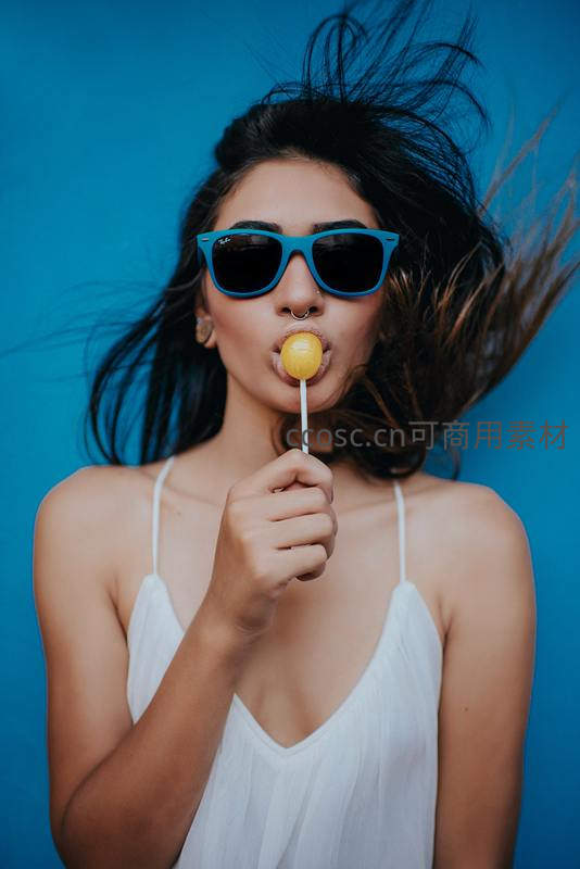 在纯净的蓝色背景下,一位戴着蓝色墨镜的年轻女子正俏皮地含着黄色棒棒糖,飞扬的秀发和轻松的姿态传递出无拘无束的青春活力与快乐情绪。