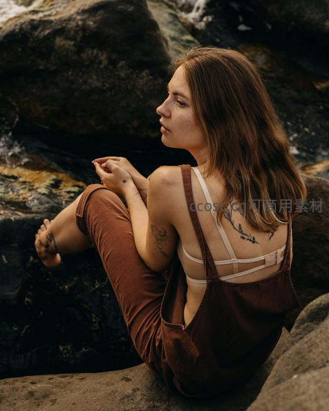 一位拥有背部纹身的女子静坐于溪流边的岩石上,侧脸凝望远方,棕色连体裤与自然环境相得益彰,展现宁静与自由的氛围。