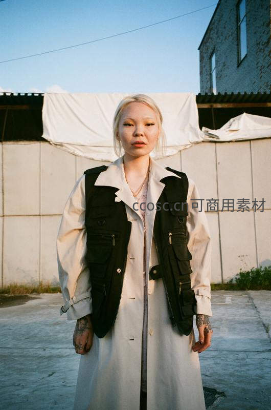 街头时尚青年,黑白拼接风衣特写