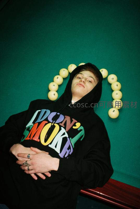 青年躺于绿色台球桌,身着彩色字母连帽衫,周围环绕台球摆成心形,手戴多枚戒指,展现慵懒、艺术与反叛的年轻态度。