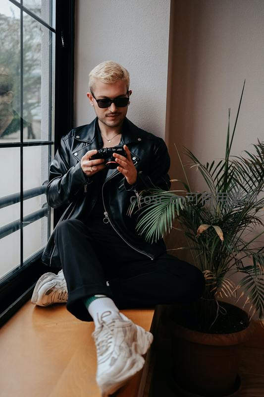 一位金发青年身着黑色皮夹克,坐在窗台边专注地操作相机,身旁绿植点缀,营造出都市休闲与艺术创作交融的氛围。