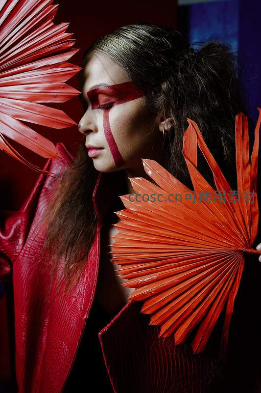 女子面部绘有醒目红色妆容,身披红色皮质外套,手持大型红色扇叶,光影交错间展现出强烈的视觉冲击力和舞台艺术感。