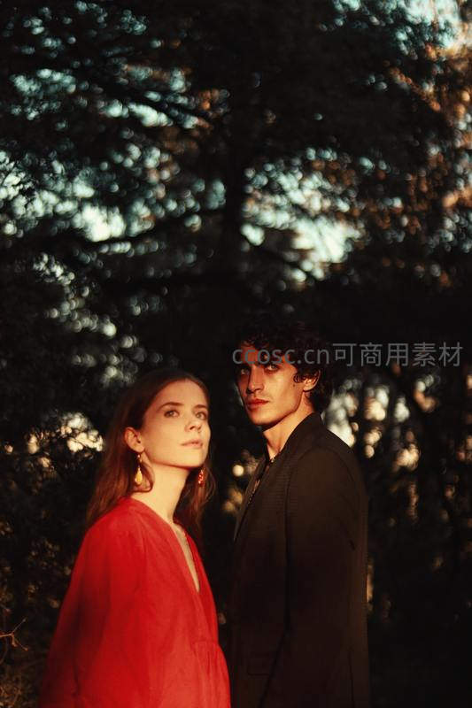 一对情侣在暮色森林中静静伫立,柔和的阳光穿过树叶洒落,勾勒出温暖而宁静的画面,传递出爱意与自然和谐共生的美好。