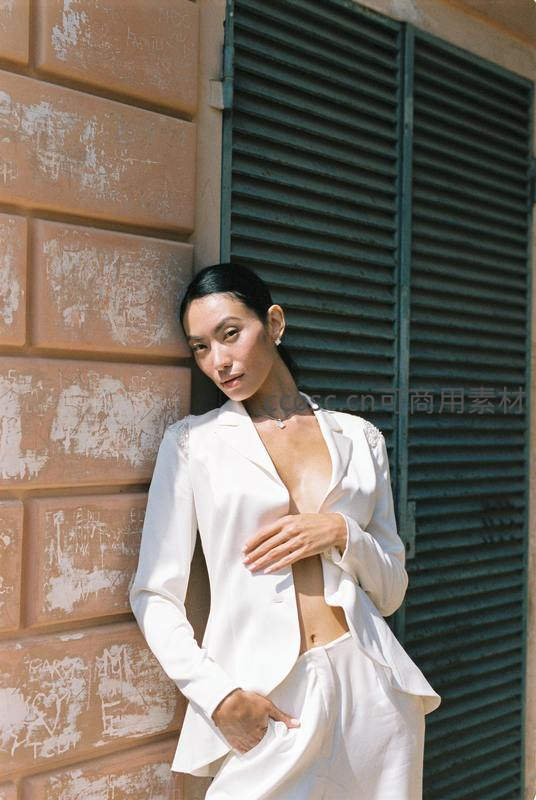 女子身着白色西装外套,靠在斑驳砖墙旁,背景是绿色百叶窗,阳光洒落,尽显都市时尚与随性魅力。