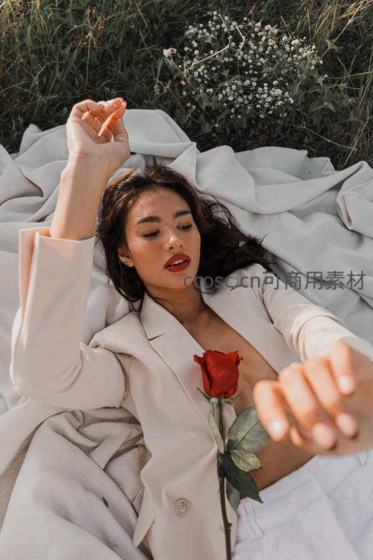 女子身着白色西装外套,慵懒躺在草地上,手中轻握一朵红玫瑰,营造出浪漫而时尚的户外写真场景。