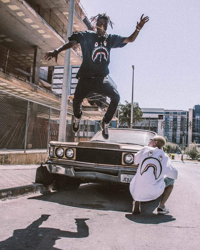 一名男子身着鲨鱼图案T恤在老式汽车前腾空跃起,另一位同伴蹲姿拍摄,背景是城市工业风建筑,充满动感与街头潮流气息。
