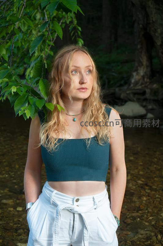 金发少女站在林间溪水旁,头顶垂落的绿叶为她遮阳,身穿蓝绿色上衣与白色裤子,神情宁静,充满自然气息。