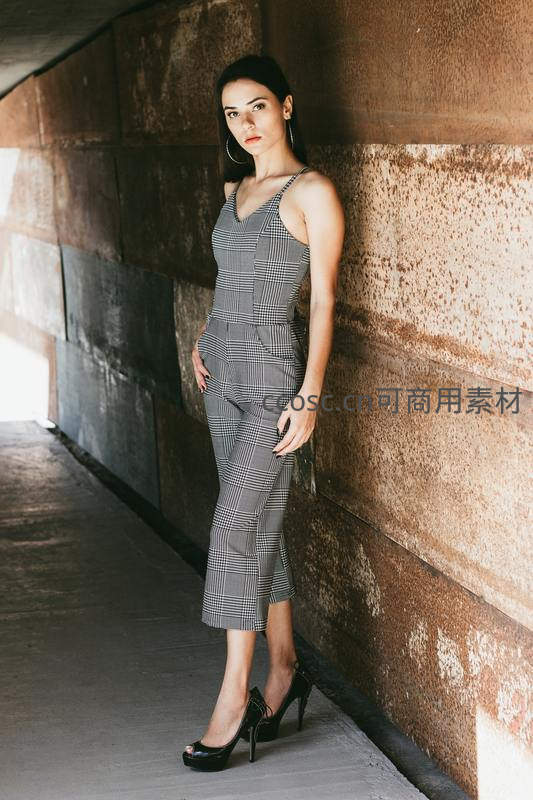 格纹连体裤美女倚靠锈墙走廊
