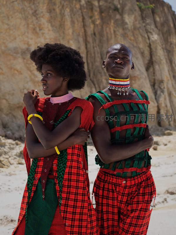 一对身着鲜艳红绿格纹与手工编织服饰的非洲男女,伫立于沙滩岩壁前,展现浓郁的民族特色与文化自信。