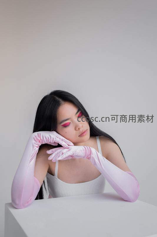 一位年轻女性佩戴粉色长手套,双手托腮,眼神低垂,妆容精致,背景纯白,突出其面部表情与手部细节,营造安静、内省的艺术氛围。