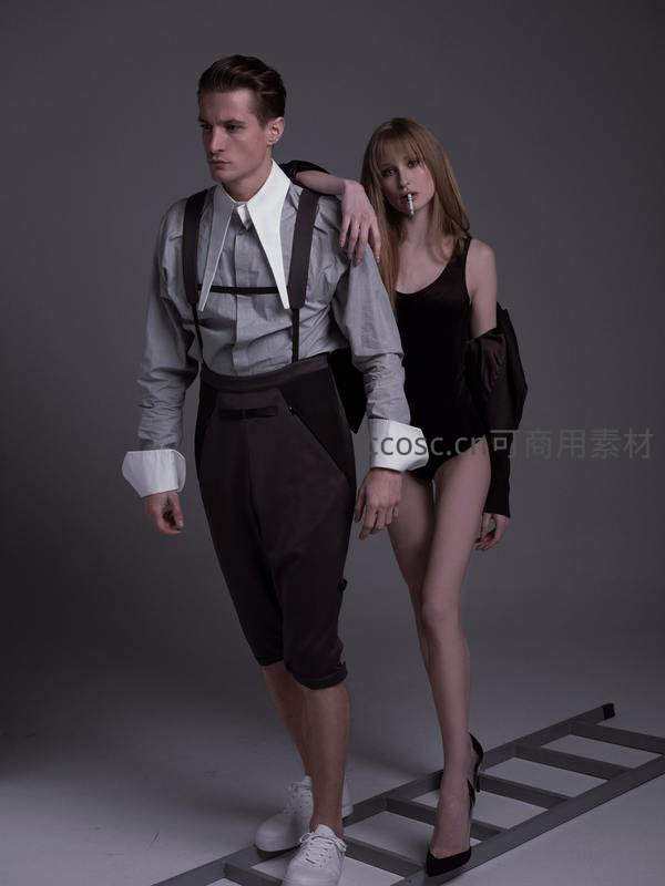 男女模特身着复古风格服装,在灰色背景下摆出戏剧化姿势,男士穿吊带裤配白衬衫,女士穿黑色连体衣,充满艺术张力。