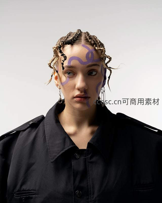 模特面部带有紫色抽象线条彩绘,眼神锐利,身着黑色工装风外套,整体造型充满戏剧张力与现代艺术感。