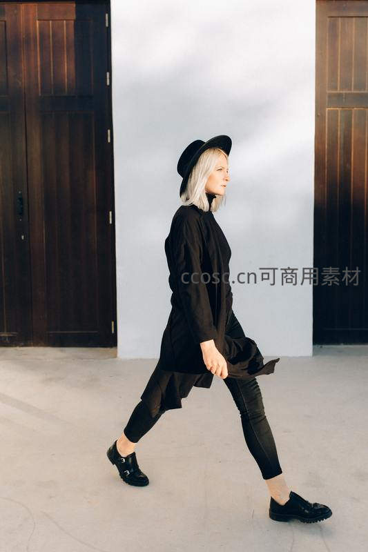 一位银发女性身着全黑套装,头戴黑色礼帽,在光影交错的木门前优雅行走,展现都市摩登与极简美学。