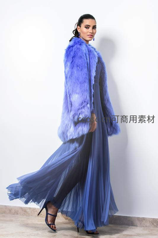 一位身着梦幻蓝渐变长裙与同色系皮草外套的女性,正优雅转身,裙摆随风飘扬,搭配精致耳饰与高跟鞋,尽显高贵典雅的时尚魅力。