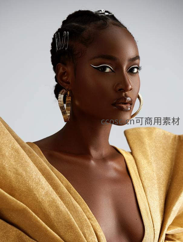 深色肌肤女性身着闪耀金色礼服,佩戴夸张金色耳环,眼线锐利,妆容精致,展现高贵典雅的时尚魅力与强大气场。