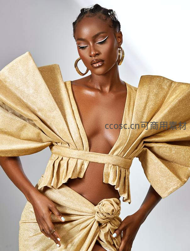 模特身着设计感十足的金色亮面套装,夸张蓬袖与腰部褶皱结饰相得益彰,展现出强烈的时尚表现力与自信从容的姿态。