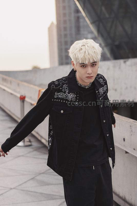 白发青年身着黑色刺绣夹克,站在现代城市天桥上,背景是几何感建筑,展现出前卫的街头潮流风格与自信姿态。