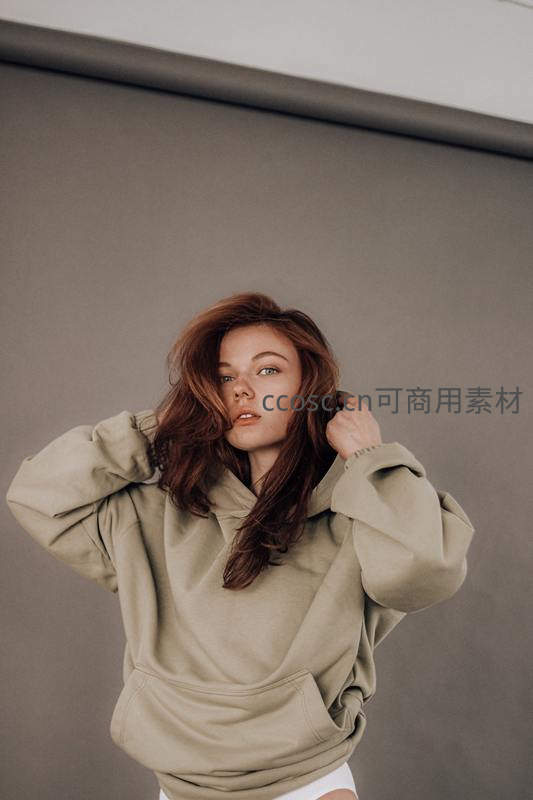 一位拥有浓密红棕色长发的女孩,身着宽松米色连帽卫衣,双手轻抚发丝,眼神直视镜头,背景为简约灰色墙面,整体风格舒适随性。