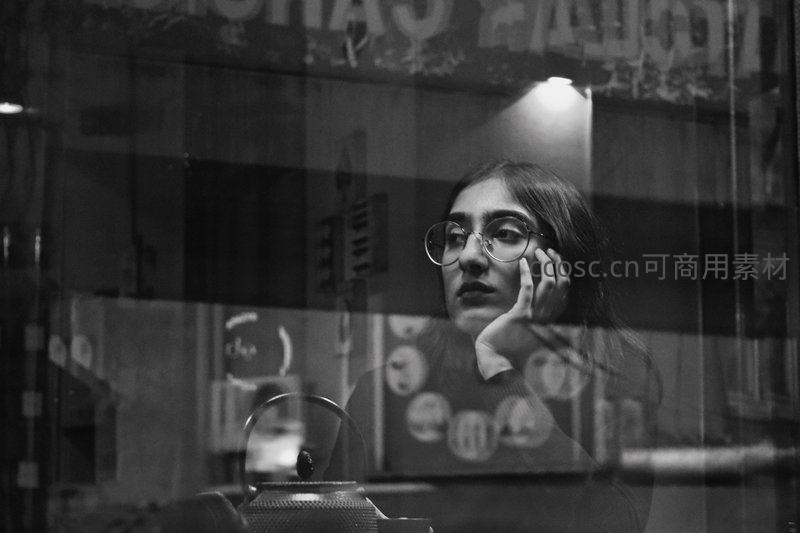 透过玻璃窗,一位戴眼镜的女子托腮凝望,窗外霓虹与室内灯光交织,营造出都市夜晚的孤独与内省氛围。